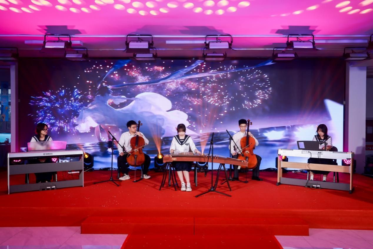 升学典礼上,教师代表、学生代表和家长代表依次发言,国际课程中心的学生们表演了以“花漾年华,繁星璀璨”为主题的文艺节目,精彩纷呈,极富艺术感染力。
